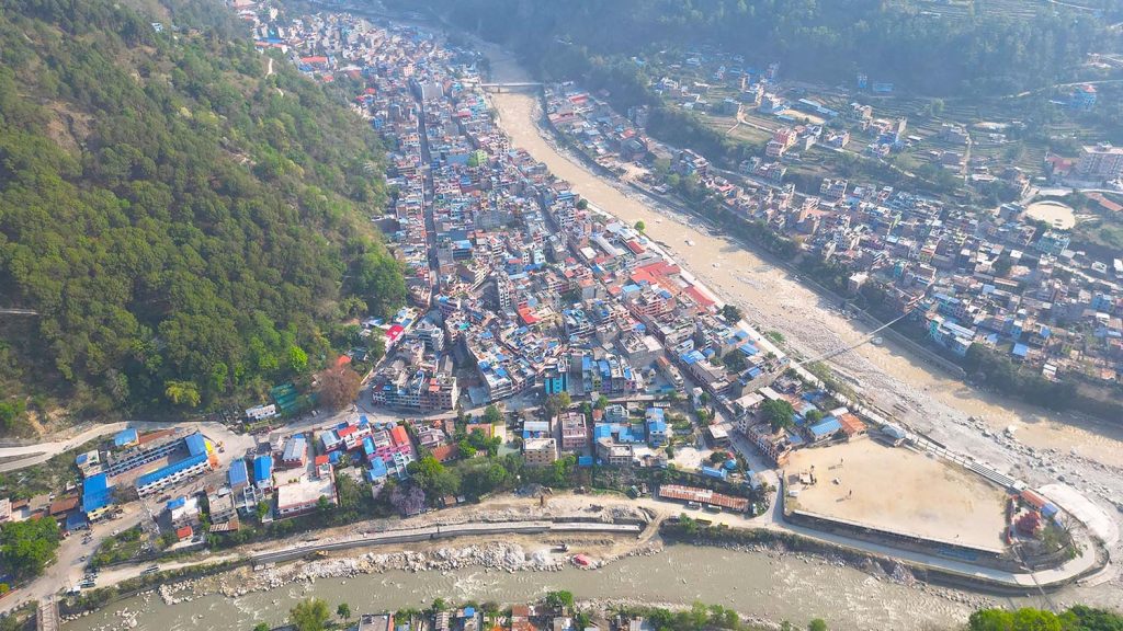 ‘लभ्लीहिल’बाट आइतबार देखिएको म्याग्दी र कालीगण्डकीको दोभानमा अवस्थित जिल्ला सदरमुकाम बेनी बजार । बेनी नगरपालिका–२ मा रहेको ‘लभ्लीहिल’देखि बेनी बजार, नदीहरु, पहाड र हिमशृङखलाको दृष्यावलोकन गर्न सकिन्छ । तस्बिरः सन्तोष गौतम/रासस